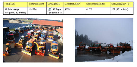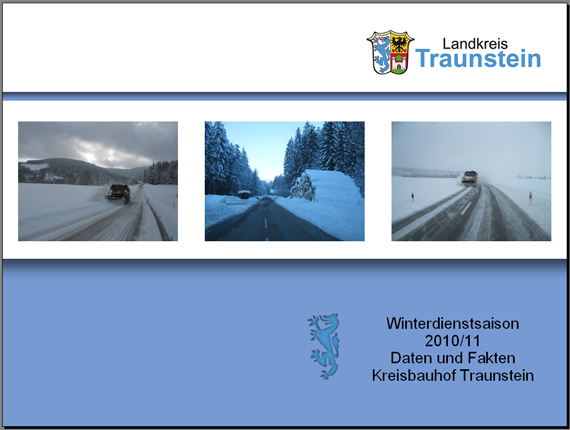 Es wurde an durchschnittlich 56 Tagen im nördlichen Teil des Landkreises und an 81 Tagen im südlichen Teil des Landkreises Traunstein Winterdienst geleistet. Die Winterdiensteinsätze haben am 20.10.2010 begonnen und dauerten bis 20.03.2011, wobei an insgesamt 125 Tagen Melderdienst in enger Abstimmung mit dem Staatlichen Bauamt Traunstein jeweils von 03.00 bis 21.00 Uhr geleistet wurde.