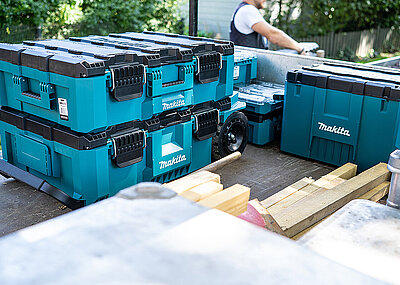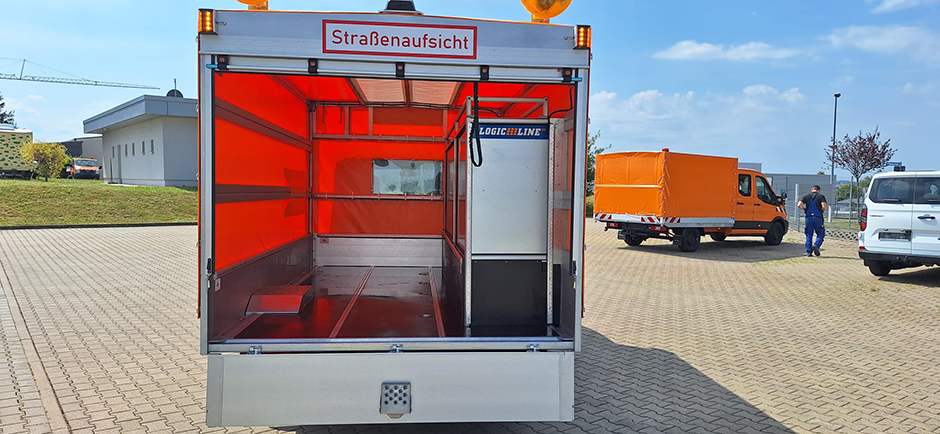 Neben der Sicherheitsausstattung – bestehend aus Warnmarkierungen, einer doppelten Warnanlage sowie einem Feuerlöscher – unterstützt das integrierte Wegstrecken-Messgerät eine präzise Einsatzplanung. Darüber hinaus zählen die beiden in die rechte Bordwand integrierten LogicLine-Werkzeugboxen vom Typ TB-125 und TB-200 zu den Aufbau-Highlights. Passend zum Heck sind diese ebenfalls mit Aluminium-Rollläden ausgestattet und somit von außen erkennbar und zugänglich.