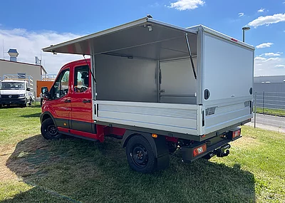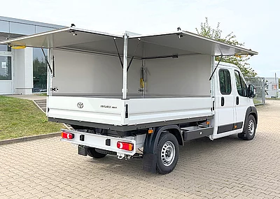 Der Dreiseitenkipper ist mit einem vier mm starken Stahlblechboden ausgestattet und auf hohe Belastung ausgelegt. Umlaufend sorgen 400 mm hohe, pulverbeschichtete Aluminiumbordwände für eine praxisgerechte Ladehöhe. Zusätzlich wurden links und rechts pendelnd gelagerte Bordwanderhöhungen aus Aluminium montiert, welche die Bordwandhöhe um weitere 400 mm vergrößern. Damit lässt sich auch loses oder voluminöses Material sicher transportieren.