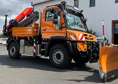 Hinter dem Fahrerhaus ist ein Palfinger-Ladekran PK 7.501 SLD5 montiert. In Kombination mit einem Greifer lassen sich so Materialien selbstständig aufnehmen, verladen und positionieren. Dies reduziert manuelle Arbeitsschritte und erhöht die Effizienz bei täglichen Einsätzen – etwa im Tiefbau, bei Instandhaltungsarbeiten oder im Grünflächenbereich.