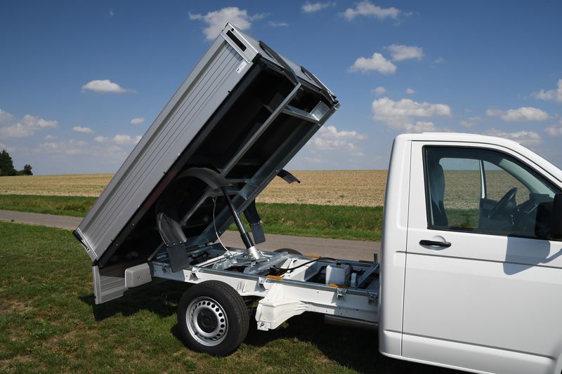 Was dagegen Potential eines Volkswagen-Transporters mit Werkspritsche angeht, so lässt sich dieser auch nutzen, indem er zum Hinterkipper umgerüstet wird. Kunath Fahrzeugbau liefert hierfür einen passgenauen und feuerverzinkten Zwischenrahmen, inklusive Teleskopzylinder und elektrohydraulischem Aggregat für den Transporter. Dieser Bausatz wird zwischen Werkspritsche und Fahrgestell montiert und durch eine Fernbedienung im Fahrerhaus gesteuert.