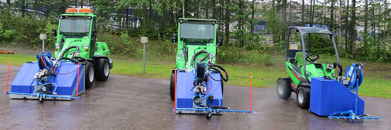 Die neuen KPL-Geräte sind länger und besser nutzbar als herkömmliche Anbaugeräte für Trägermaschinen. Wenn die Trägermaschine anderweitig benötigt oder gerade erneuern wird bzw. eine planmäßige Reparatur ansteht, ist die neue KPL-Einheit einfach an einer anderen Trägermaschine zu befestigen. DYNASET bietet Schnell-Kupplungen für fast alle Herstelleradapter. Die neuen Straßenwaschanlagen sind zudem mit einer drehbaren Waschrohranlage ausgestattet – außer beim kleinsten Modell KPL-S. Die Waschrohreinheit ist mit hydraulischer und elektrischer Drehsteuerung erhältlich. Durch das Drehen der Straßenwaschrohre wird der Schmutz gezielt in eine Richtung getrieben. Man kann nahtlos an Hauswänden entlang reinigen. Alle DYNASET-Straßenwaschanlagen sind mit Waschpistole und 20 Meter Schlauchtrommel mit Federrückzug ausgestattet, was die Reinigung von Hauseingängen, Einfahrten, Ecken und Treppen erleichtert. Die Anlagen sind auch zur Staubbindung auf unbefestigten Wegen einsetzbar.