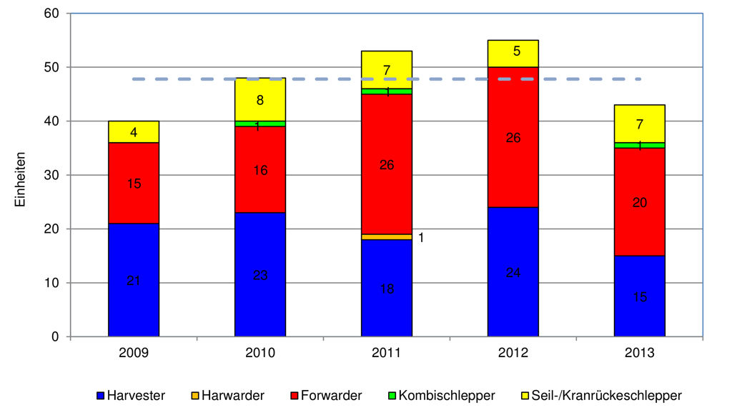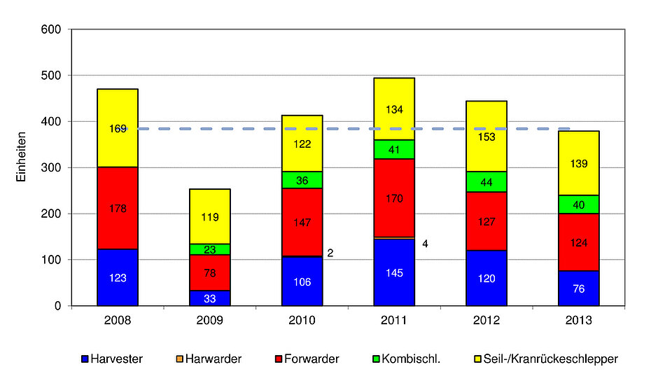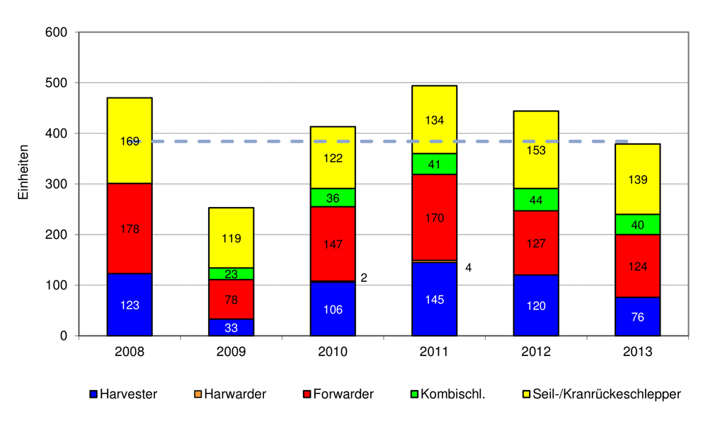 Laut KWF-Maschinenstatistik wurden im Jahr 2013 in Deutschland insgesamt 303 neue Forstschlepper und 76 Vollernter (Harvester) für den professionellen Forsteinsatz verkauft. Für den deutlichen Rückgang der Verkaufszahlen war vor allem der stockende Absatz von Harvestern ausschlaggebend. Es wurden 37 Prozent weniger Maschinen verkauft, als im Vorjahr. Der Verkauf von Forwardern ging dagegen nur um drei Prozent - auf 124 Maschinen - zurück. Bei den Kombischleppern (Lang- und Kurzholz) war ein neun prozentiger Rückgang (40 Maschinen in 2013) zu verzeichnen. Der Absatz von Langholz-Schleppern liegt - mit 139 verkauften Einheiten - ebenfalls neun Prozent unter dem Vorjahresniveau.