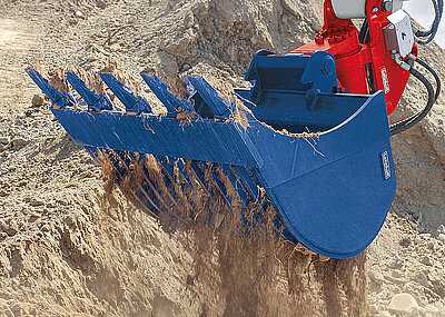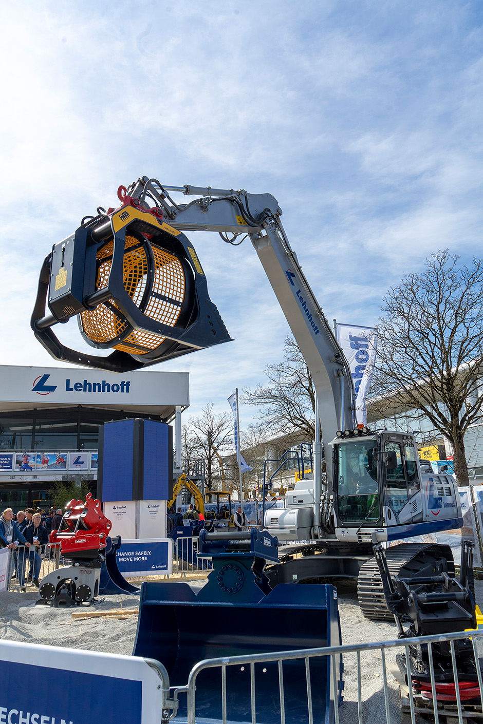 Während der diesjährigen bauma zeigte Lehnhoff an drei Demofahrzeugen eindrucksvoll, wie moderne Schnellwechselsysteme den Bagger zum echten Geräteträger machen. Unterschiedliche Anbaugeräte wie Schwenklöffel, Sortiergreifer, Grabenräumlöffel oder Sieblöffel kamen zum Einsatz – in wechselnden Szenarien, vom Grabenräumen über das Separieren von Kies bis hin zum Materialumschlag. Im Zentrum: vollhydraulische Schnellwechsler wie der SQ70V.