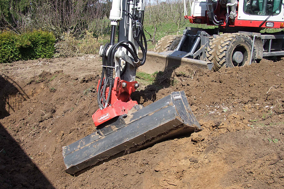Der Lehmatic Powertilt ermöglicht das Schwenken aller Anbaugeräte bis zu 2 mal 90 Grad. Insbesondere auch schmale Löffel erhalten damit eine produktivitätssteigernde Beweglichkeit. Ideal ist er auch für sauberes Grabenräumen oder für gezielte Materialaufschüttung.