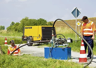 Druckluftspaten, -erdraketen, -hämmer, Druckluft zum Reinigen, Warten, Reparieren … der Einsatz von Druckluft im Garten- und Landschaftsbau ist vielfältig – und dank moderner Kaeser Mobilair-Kompressoren kann er auch kostengünstig und energieeffizient sein.