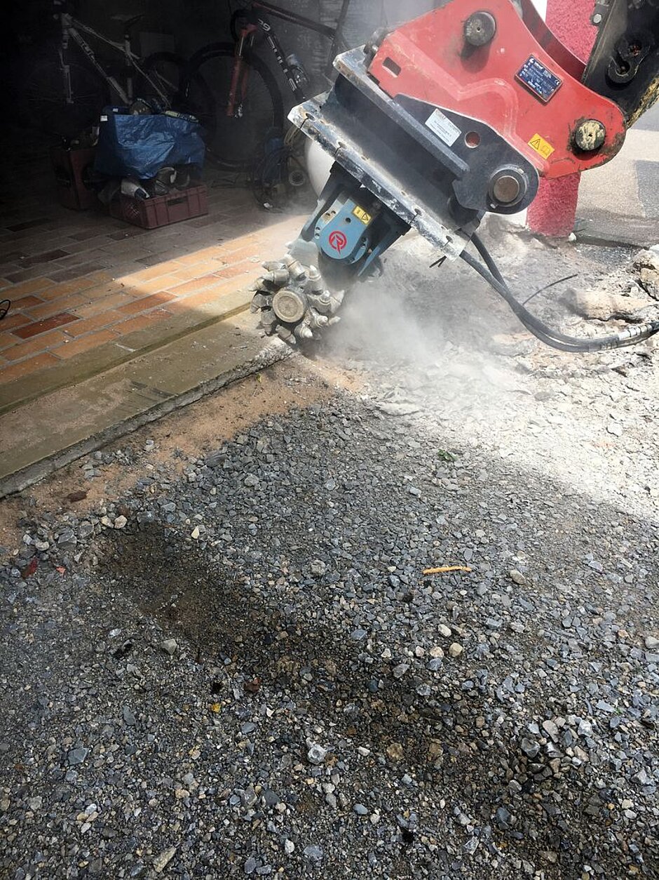 Ist die Rampe zur Garage kurz oder deren Neigungswinkel zu groß, sitzt das Auto häufig auf. Die Folge ist etwa ein verkratzter Stoßfänger oder eine leckende Ölwanne. Deshalb musste der alte Betonsockel auf die gewünschte Höhe gebracht werden. Im Gegensatz zum manuellen Abbruch kann mit der Rockwheel Schicht für Schicht abgetragen werden. So kann während des Fräseinsatzes gemessen werden, wie viel Beton noch weg muss. Die optimale Meißelordnung der Rockwheel garantiert die notwendige Laufruhe bei maximaler Leistung.