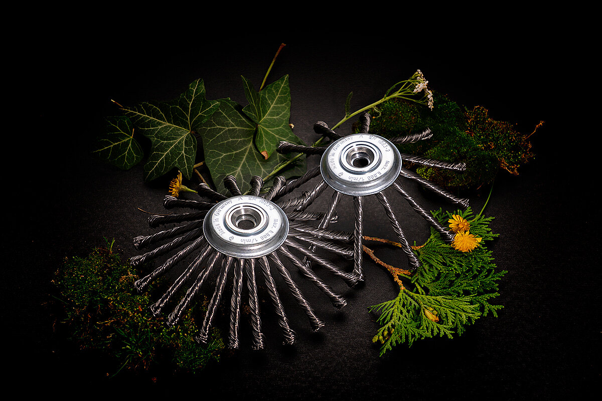 Für den Einsatz an Motorsensen bieten sich schwere Bürstenvarianten mit dichtem Besatz an. Sie ermöglichen eine kraftvolle und zeitsparende Reinigung großer Flächen. Für die Nutzung von Akkusensen eignen sich leichte Bürstenmodelle. Dank kleinem Topf und reduziertem Besatz lassen sie sich problemlos betreiben und liefern trotzdem gute Reinigungsergebnisse.