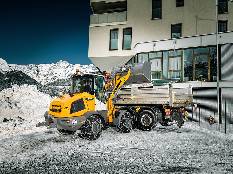 Die Compactlader von Liebherr − L 504 bis L 508 Compact − eignen sich besonders für den Winterdienst in engen, städtischen Bereichen. Dank der kompakten Bauweise und hohen Wendigkeit lassen sie sich problemlos auf schmalen Straßen und Gehwegen einsetzen. Durch die niedrige Bauhöhe von weniger als 2,5 Metern (L 504 und L 506) ist ein rascher und unkomplizierter Transport möglich, womit niedrige Ein- und Durchfahrten kein Hindernis darstellen. Zu einem besonders tiefen Schwerpunkt führt die kompakte Bauweise und ermöglicht damit hohe Nutzlasten bei maximaler Stand- und Kippsicherheit – ideal etwa beim Abtransport von Schneemassen. Zudem sind die Compactlader mit verschiedenen Anbaugeräten kompatibel, wie zum Beispiel die Leichtgutschaufel für das Verladen von Schnee, was ihre Vielseitigkeit im Winterdienst erhöht. Automatische Selbstsperrdifferenziale sorgen für ordentlich Traktion – auch bei schwierigen Bodenverhältnissen wie etwa Glätte.