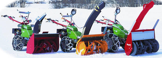 Zur Auswahl stehen: vier Kombi-Kehrmaschinen für Schnee und Schmutz, drei Räumschilder sowie Schneefräsen für Weichschnee, Halbhartschnee und für Hartschnee.