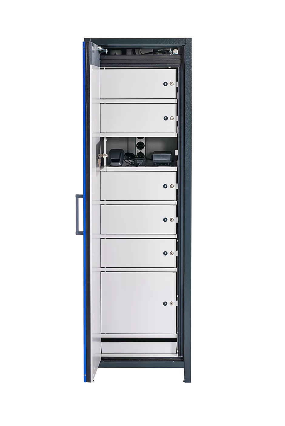 Die zweite Schrankvariante mit fünf brandgeschützten Schließfächern verhindert die Brandausweitung im gesamten Schrankinnenraum und schützt die eingelagerten Akkus vor einem Flammenübergriff. Ein weiterer Vorteil: Im Brandfall braucht der Anwender nur das betroffene Schließfach evakuieren. Der restliche Schrank und die weiteren eingelagerten Akkus werden nicht in Mitleidenschaft gezogen. So lässt sich der Schrank nach einem Brandfall in kürzester Zeit wieder in Stand setzen. In jedem Schließfach ist ein Temperatursensor verbaut. Meldet dieser eine Brandentstehung, erscheint am Schließfach eine LED-Funktionsanzeige und am Schrank ein akustischer und optischer Alarm, der an eine Gebäudeleittechnik weitergeleitet wird.