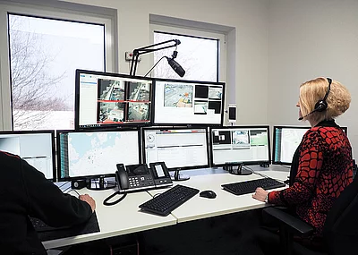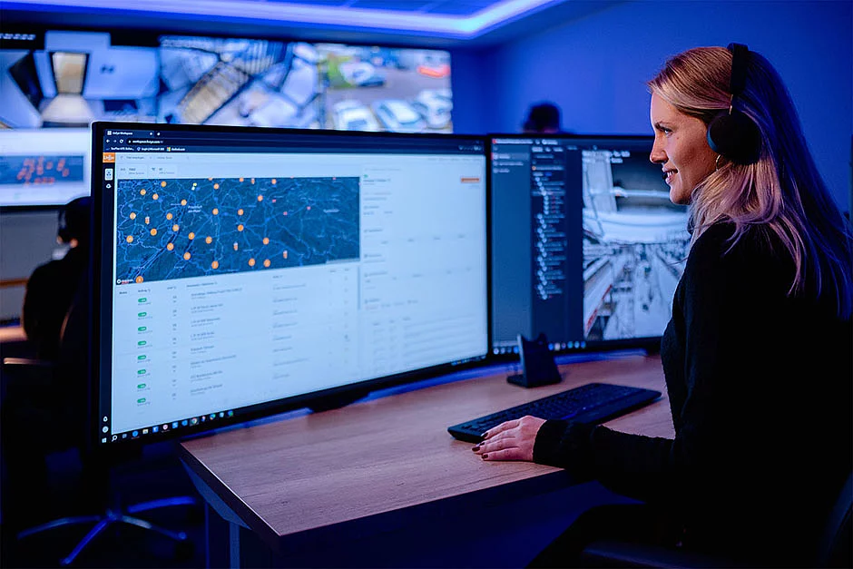 Fünf integrierte Kameras eines NSTR-Systems liefern gestochen scharfe Bilder über eine Fläche von rund 4.300 m². Mit einem Überwachungsradius von 200 Grad spähen sie bis in kleinste Ecken und Winkel. KI-gestützte Analysesoftware bewertet die Bilder – treten Unbefugte in die Risikozone ein, erfolgt eine Meldung in die 24/7-besetzte Leitstelle, die umgehend Maßnahmen nach Vorgabe des Kunden einleitet. Über integrierte Lautsprecher kommt es zur direkten Täteransprache, welche zur Abschreckung der Eindringlinge dient. Geschultes Personal sichert Beweismittel und alarmiert bei Bedarf Polizei und Sicherheitsdienst von dem Vorfall. Als wirkungsvolle Ermittlungshilfe übergeben Operatoren Aufnahmen von Personen und Kennzeichen den hinzugezogenen Beamten – ein 36-facher Zoom der steuerbaren PTZ-Kameraeinheit sorgt für verblüffende Deutlichkeit.