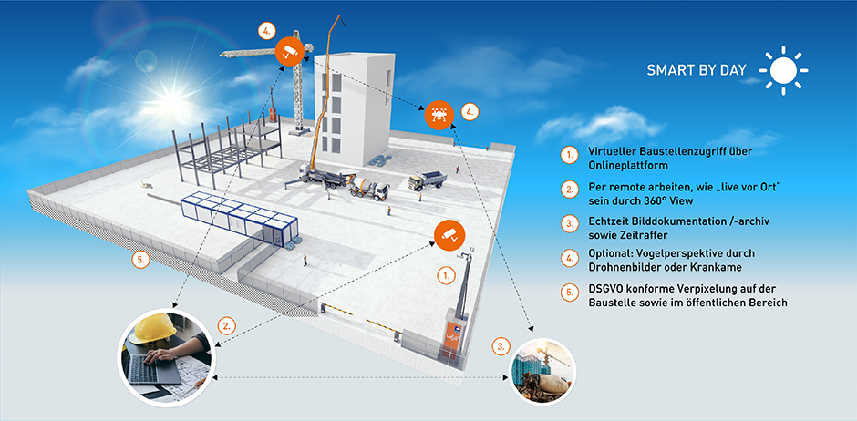 Je mehr Baustellen, desto wichtiger der Überblick – und umso schwerer. Zudem liegen Bauplätze oft weit voneinander entfernt. Dies verlangt von Verantwortlichen Aufwand zur Situationserfassung. Mit der Funktion „Smart by Day“ erleichtert Sicherheitsunternehmen LivEye Bauleitern, Betreibern und Architekten die Arbeit: Während LivEye-Kameratürme nachts zu schützende Bereiche absichern, ermöglichen sie tagsüber eine virtuelle 360-Grad-Baustellenansicht von jedem Ort aus. In Übereinstimmung mit der DSVGO kontrollieren und dokumentieren so Zuständige den Fortschritt ihres Projekts.