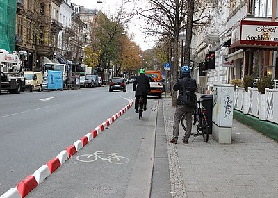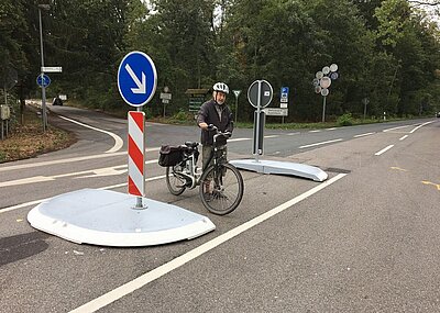 Um eine schnelle Lösung mit geringem Montageaufwand ohne Verkehrsbehinderung und ohne Straßenaufbruch zu gewährleisten, kommen hier gleich zwei Systeme aus dem Lüft Recycling-Baukasten zum Einsatz. Die Kombination aus Verschwenkungsinsel und Leitbord, versetzt eingebaut, beschildert und markiert, bietet sich hervorragend an, um zwei beidseitig alternierendeVerschwenkungen herzustellen.