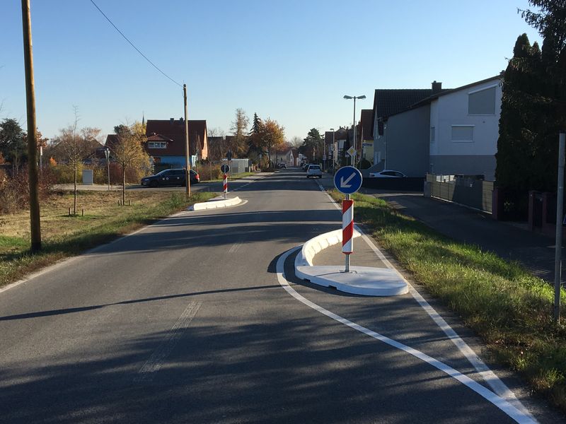 Durch die Verschwenkungen wird die Achse des Autofahrers optisch unterbrochen. Und durch die Länge der jeweiligen Einengung, die mit den Leitborden erzeugt wird, bleibt dem Fahrzeugführer nichts anderes übrig, als die Geschwindigkeit anzupassen.