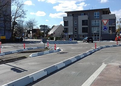 Mit einer intelligent ausgeklügelten Kombination aus den 0,80 m schmalen Beruhigungsinseln und den 0,25 m hohen Leitborden aus Recycling-Kunststoff der Lüft GmbH werden die Radfahrer sicher geleitet und der MIV gleichzeitig deutlich auf die geänderte Verkehrsführung aufmerksam gemacht.