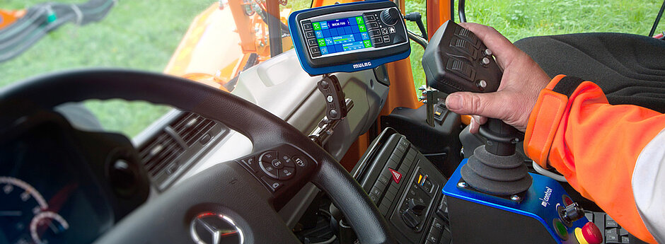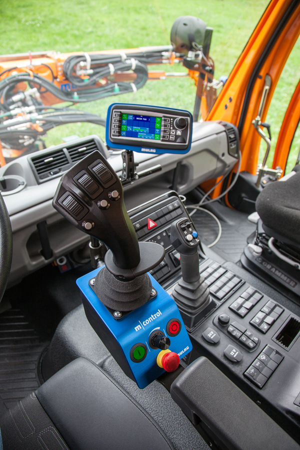 Mit der neuen MULAG-Gerätesteuerung m|control hat der ausgewiesene Spezialist für Straßenunterhaltungsgeräte ein völlig neues Steuerungskonzept für Ausleger und Randstreifenmähgeräte entwickelt. Der zum Patent angemeldete MULAG-Joystick kann gleich sechs Proportionalfunktionen auf einer Ebene abrufen, durch einfache Umschaltung können so zwei Auslegergeräte mit einem Joystick bequem gesteuert werden. Damit vereinfacht sich der tägliche Arbeitseinsatz mit einem oder mehreren Auslegern enorm, das gesamte Bedienkonzept ist ergonomisch stark verbessert worden. Wichtige Informationen und Bedienfunktionen werden übersichtlich im neuen Farbdisplay angezeigt und je nach Bedienstatus zur Aktivierung bereitgestellt. Außerdem kann der Bediener über die Anzeige in einen Diagnose- und Servicemodus wechseln, um im Wartungs- oder Störungsfall umfangreiche Informationen zu erhalten. Über CAN-Bus sind die Bedienteile an dem m|tronic-Steuerungsrechner angebunden und beeinflussen über diesen die kompletten Ausleger- bzw. Randstreifenmähgerätefunktionen. Über eine USB-Schnittstelle können Wegstreckendaten und Diagnosewerte ausgelesen werden.