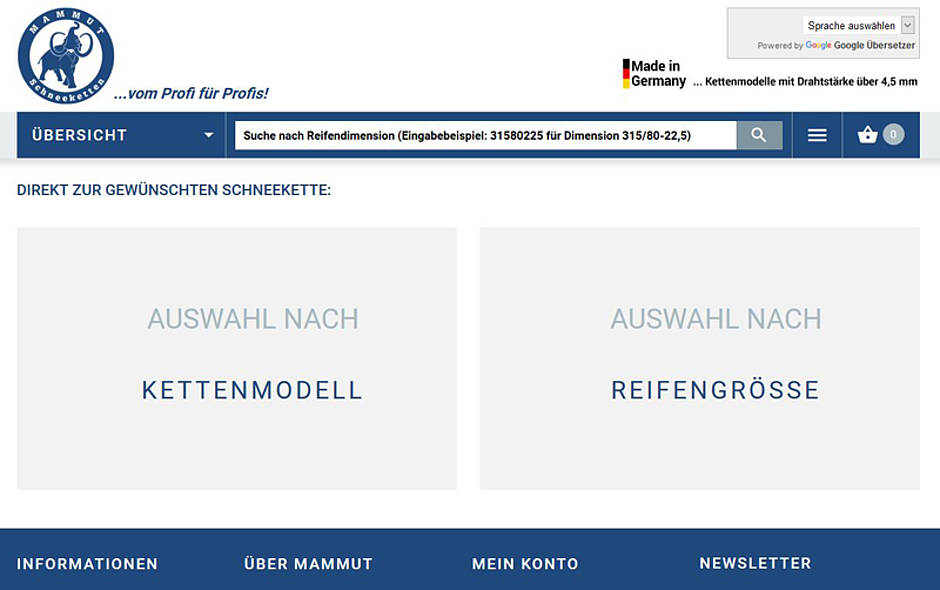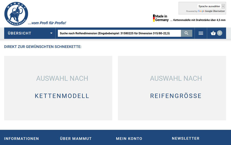 MAMMUT präsentiert einen leistungsfähigen Online-Shop, der keine Öffnungszeiten kennt. Bereits während der Eingabe der ersten Ziffern der entsprechenden Reifengröße im Schnellsuchfeld erscheint eine Liste der verfügbaren Dimensionen. Über einen Klick gelangt der Kunde zur Produktübersicht.