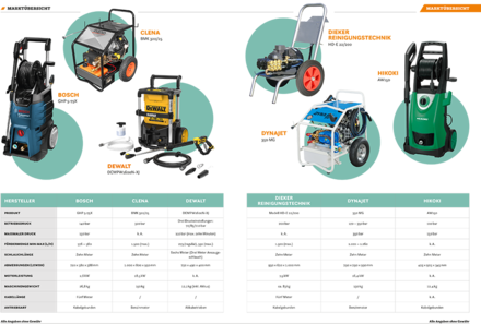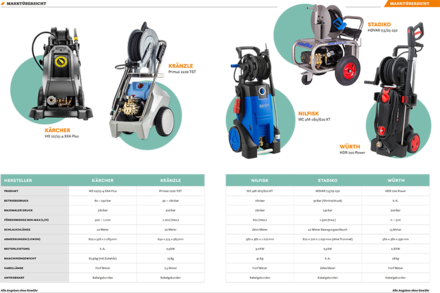 Fokus der Marktübersicht liegt auf mobilen Kaltwasser-Hochdruckreinigern bis 350 bar, wie sie auf vielen Bauhöfen zum Einsatz kommen. Die Funktionsweise steckt schon im Namen. Wasser wird hier von einer Kolbenpumpe unter starken Druck gebracht. An der Reinigungsdüse oder dem Sprühkopf wird dadurch eine hohe Flüssigkeitsgeschwindigkeit erreicht, womit sich Wasser druckstark und in großen Mengen ausbringen lässt. So wird selbst hartnäckiger Schmutz entfernt, wobei sich für schwere Fälle oder Spezialaufgaben oftmals auch diverse Reinigungsmittel bereits in der Maschine beimischen lassen.
