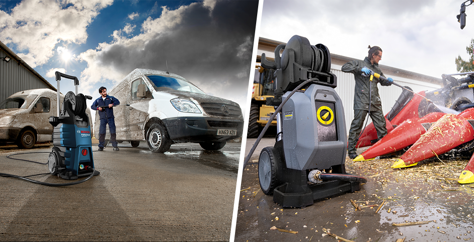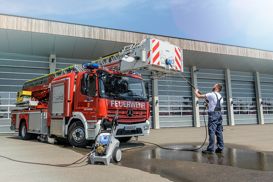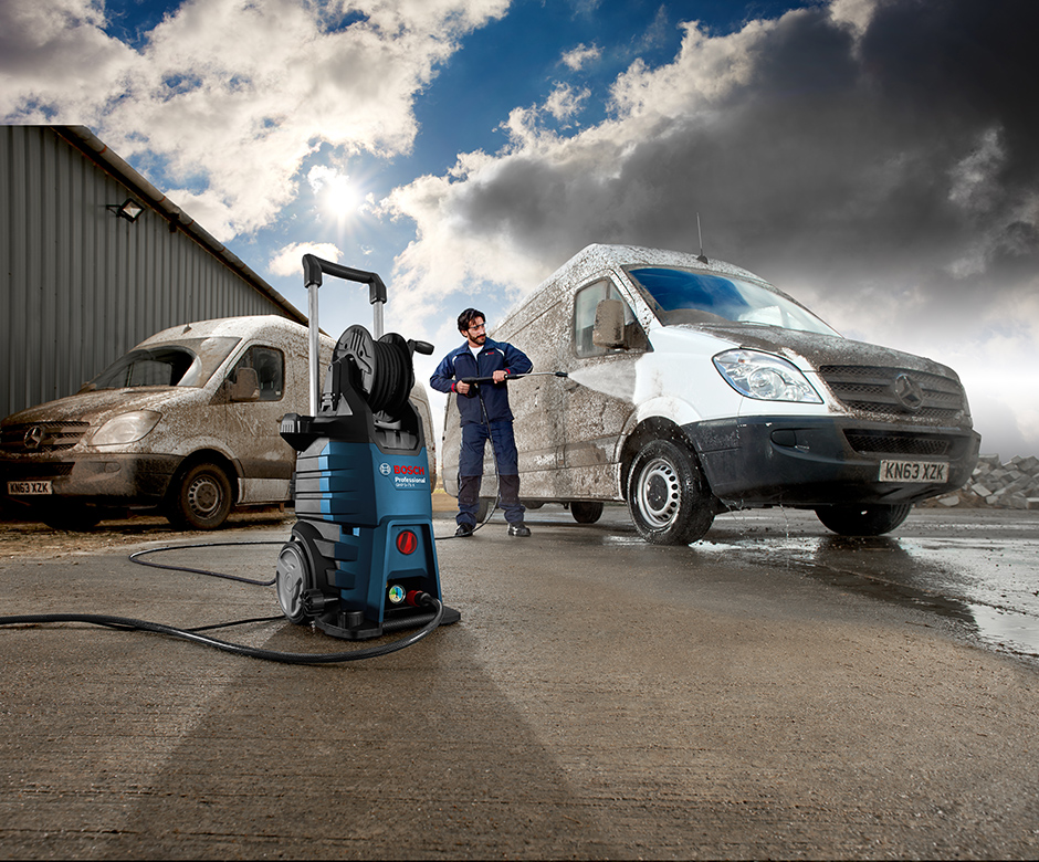 Bei der Auswahl von Hochdruckreinigern für eine Aufgabe sind drei Faktoren entscheidend: der Antrieb, der zur Verfügung stehende Druck und die Wassermenge, die gefördert werden kann. Mit höherem Druck lassen sich größere Flächen schneller reinigen, während mehr Wasser für eine höhere Prallkraft und Schwemmleistung sorgt, sodass der gelöste Schmutz besser abtransportiert wird. Während bei der Nutzung auf dem heimischen Bauhof noch ein kabelgebundener elektrischer Antrieb zum Betrieb vorzuziehen ist, bieten sich bei der Benutzung abseits der Betriebsstrukturen entweder Akku- oder Benzinmotor-Optionen, wenn gerade kein Generator zur Hand ist. Ebenfalls sollten Druck und geförderte Wassermenge nach den geplanten Einsatzszenarien ausgewählt werden. Daraus ergibt sich, wie viel Power mindestens benötigt wird. Immerhin kann nicht alles mit derselben Einstellung gereinigt werden. Während für eine Autowäsche schon 85 bar ausreichen, lassen sich Häuserfassaden nur mit einem Druck ab 130 bar säubern. Vor allem Geräte mit mehreren Einstellmöglichkeiten bieten deswegen eine höhere Flexibilität.