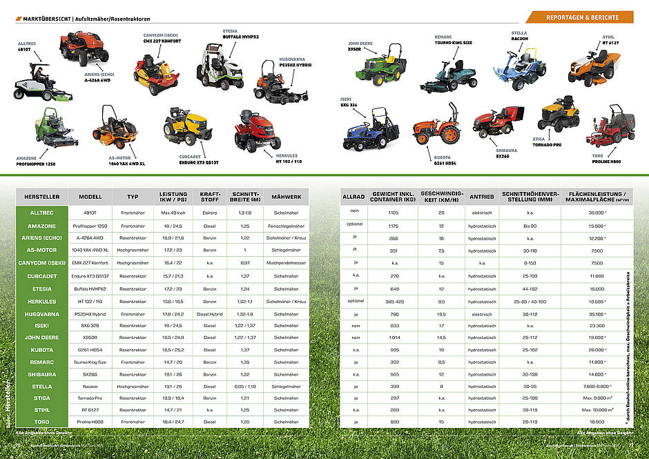 Es war gar nicht so einfach, eine saubere Grenze für unsere Marktübersicht zu finden: Nimmt man nur reine Rasentraktoren mit Zwischenachsmähwerk oder auch Frontmäher mit in die Übersicht? Und, was ist mit den robusten Hochgras- und Gestrüppmähern? Wir haben beschlossen, möglichst alles mit rein zu nehmen, um unseren Lesern zu zeigen, was an „Mähtechnik mit Sitz“ zu haben ist: Damit wir hinsichtlich der Flächenleistung zumindest irgendwo vergleichbar bleiben, haben wir den Riegel bei ca. 25 PS vorgeschoben. Denn hier sehen wir die Grenze von Rasentraktor bzw. Aufsitzmäher zum Kompakttraktor. Hat ein Hersteller – wie z.B. Kubota – ein sehr breites Produktportfolio, dann haben wir das für unsere Ansprüche größtmögliche Modell in der besten Ausstattung gewählt, wenn möglich auch mit Container oder sogar Hochentleerung.