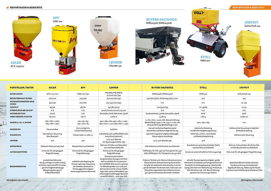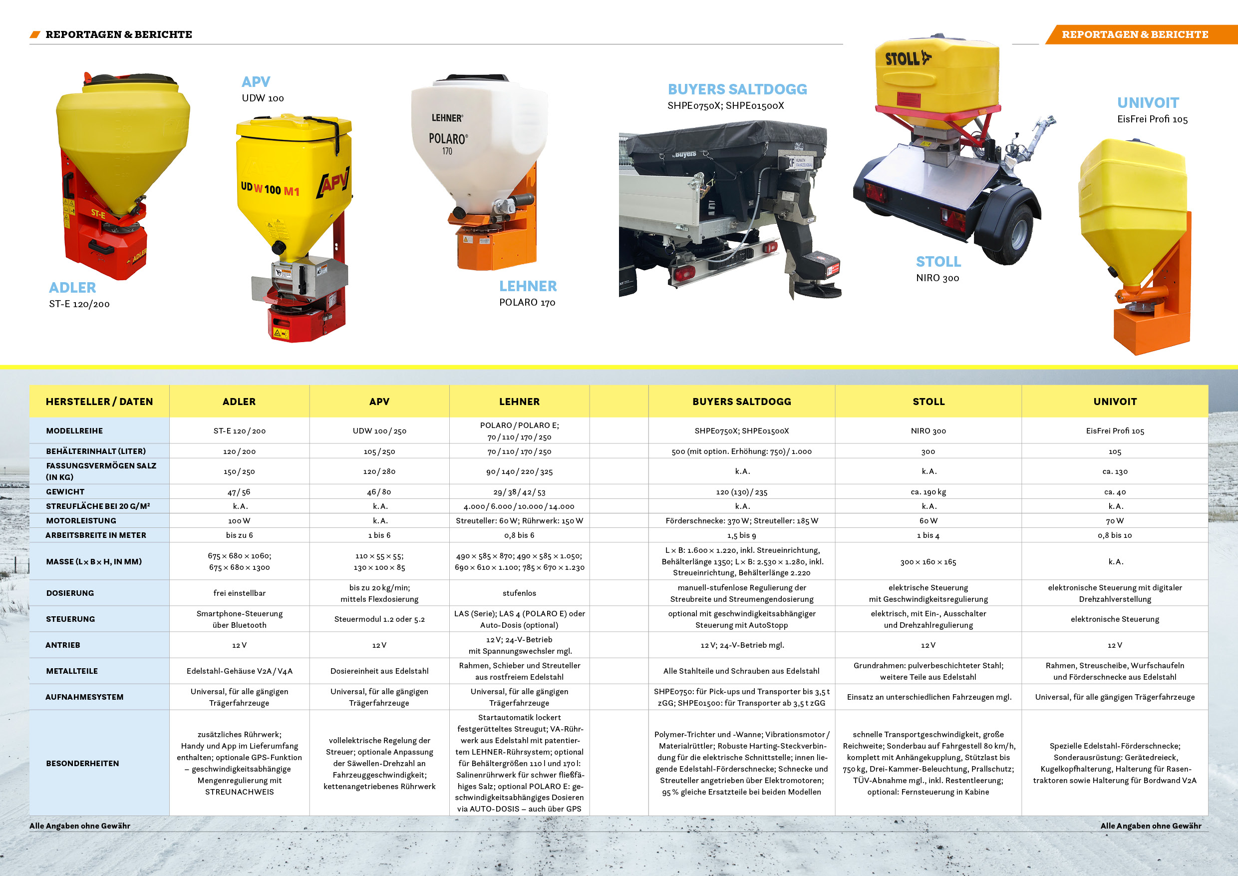 Die Mehrzahl der Produzenten setzen bei Aufnahme, Gestell und Rührwerk auf solide Stahlteile aus Edelstahl, um trotz der hohen Abrasivität der auszubringenden Materialien eine beachtliche Durabilität der Streuersysteme zu erreichen. Dagegen kommt bei den Behältern meistens ein korrosionsbeständiger, leichter PE-Aufbau zum Einsatz. Selbstredend werden diverse Behältervolumina angeboten, wodurch sich die jeweilig benötigte Menge an Salz, Splitt, Sand oder Gemischen an die Arbeitsanforderung anpassen lässt. Übrigens können mit den Zwölf-Volt-Elektrostreuer im Sommer bspw. auch Dünger oder Zwischenfrüchte ausgebracht werden.