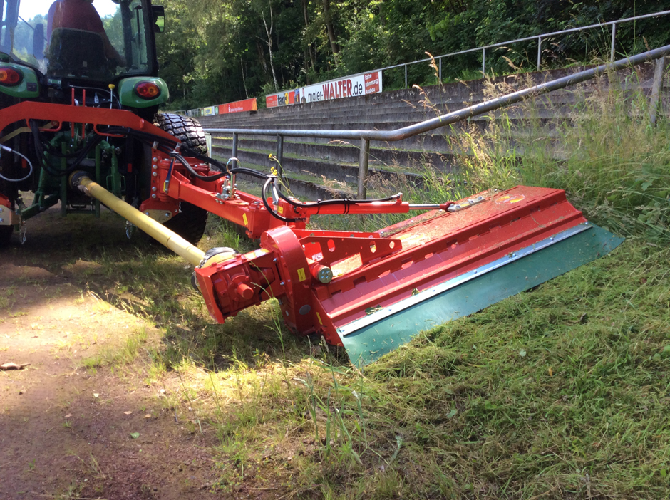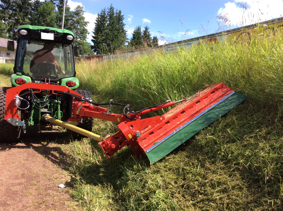 Das Seitenmulchgerät SSP bietet doppelte Einsatzmöglichkeiten: Es kann als Heckmulcher direkt hinter dem Schlepper eingesetzt werden. Mit dem langen Parallelogramm wird es seitlich neben den Schlepper geschwenkt, um an Wege- und Straßenrändern sowie Böschungen und Gräben zu mulchen. Ein stufenloser Neigungsbereich von 90 Grad nach oben und 60 Grad nach unten sowie stufenlos einstellbare Schwenkbereiche ermöglichen ein größtmögliches Einsatzgebiet.