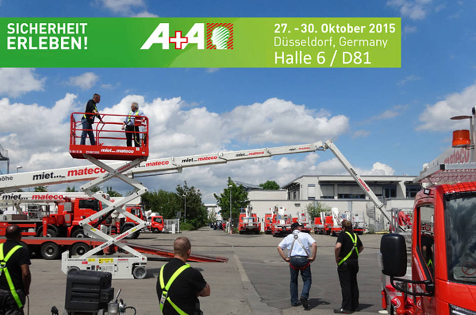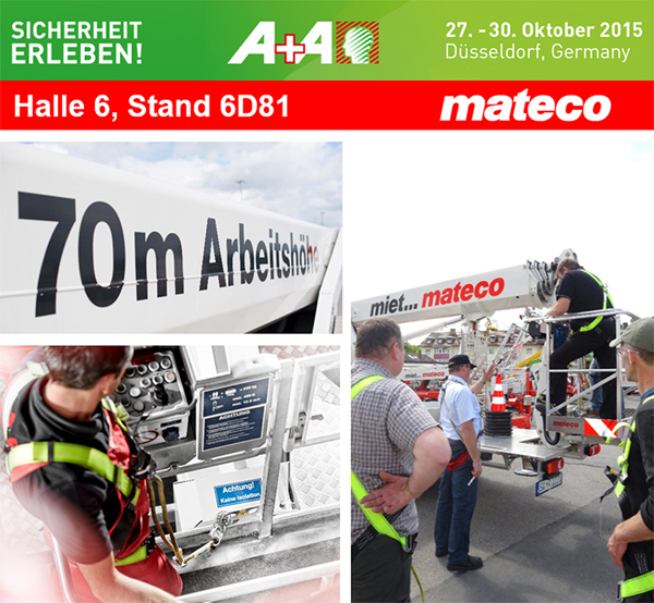 Auf der größten Fachmesse zum Thema Arbeitsschutz und Arbeitssicherheit, der „A+A“ in Düsseldorf, die vom 27. - 30. Oktober 2015 stattfindet, informiert mateco über alle notwendigen Sicherheitsaspekte im Umgang mit einer Arbeitsbühne – Vom Tragen einer „PSAgA“ – persönlichen Schutzausrüstung gegen Absturz, bis hin zur Erläuterung von Bedieneinheiten, Sicherheitseinrichtungen im Arbeitsbühnenkorb und den typischen Gefahren und Unfallquellen.