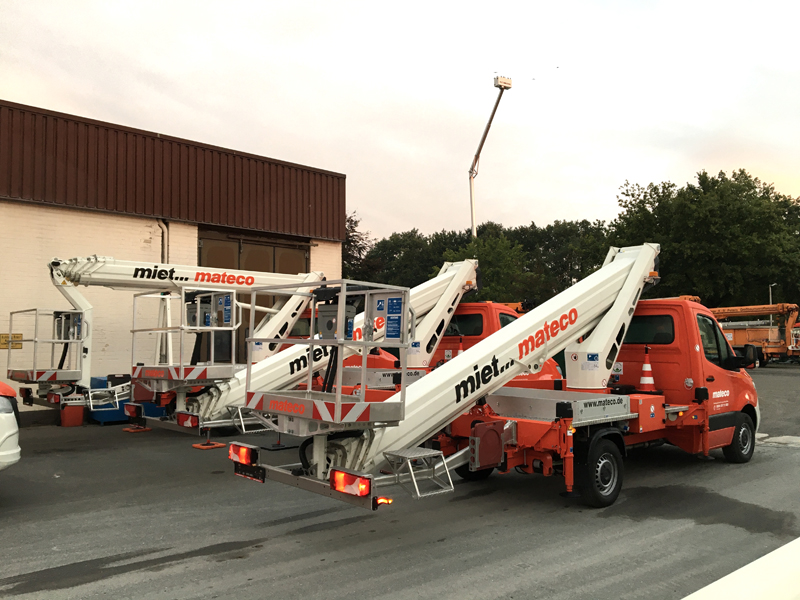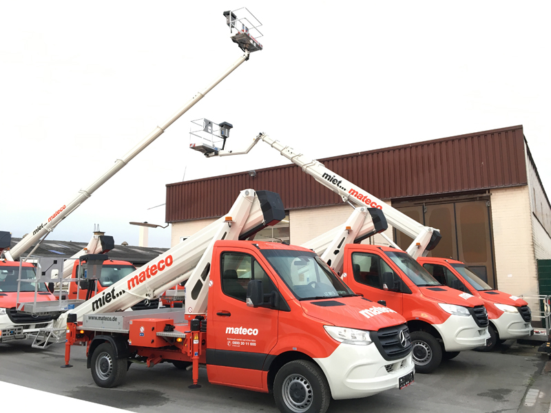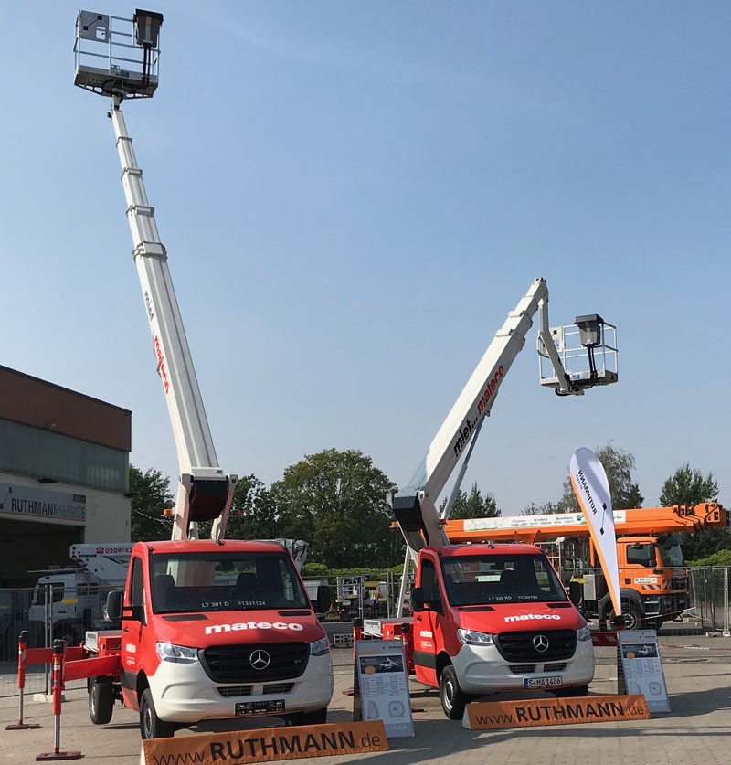 Ein großer Teil der Mateco Investition geht in die erfolgreichen 3,5-Tonnen-Steiger der neuen TB-/TBR-Baureihe – 40 Stück an der Zahl – bestehend aus TB 300, TB 290 pro, TB 270 pro, TBR 260 und TBR 230. Die 3,5-Tonnen-Lkw-Arbeitsbühnen sind mit dem Pkw-Führerschein der Klasse B fahrbar und damit für die Vermietung besonders attraktiv. Die innovative Neuentwicklung von RUTHMANN bietet erstmals bis zu 30 m Arbeitshöhe auf 3,5 Tonnen und Reichweiten von bis zu 18,10 Meter. Die Korblast beträgt serienmäßig 250 kg und kann auf Wunsch auf bis zu 300 kg erhöht werden. Alle RUTHMANNSTEIGER TB 300 von Mateco wurden mit dem 300 kg Arbeitskorb ausgestattet.