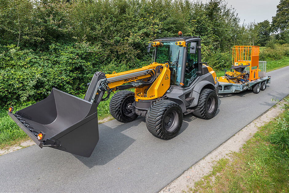 Maximale Flexibilität im mobilen Einsatz ermöglicht die Zulassung als LOF-Zugmaschine mit einer Höchstgeschwindigkeit von 40 km/h. So können die benötigten Anbaugeräte gleichzeitig auf einem Anhänger mittransportiert werden.