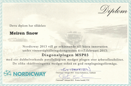 Es liegt uns sehr nahe, dass unsere Pflüge nicht nur nach den Worten, sondern nach den Taten gemessen werden. Unsere druckverstellbaren Doppel-Räumleistensystem wurden vom Nationalen Schwedischen Institut für Straßen- und Verkehrsforschung getestet und für die besten in der Geräteklasse befunden. Zusätzlich wurde die Next Generation Autobahn- und Straßen-Schneepflug MSPN 4604 und das 3in1 verschiebbare Parallelogramm auf dem Winterdienstkongress und Messe Nordicway 2013 (6-7 Februar 2013 in Östersund, Schweden) mit dem Innovationspreis gekürt.