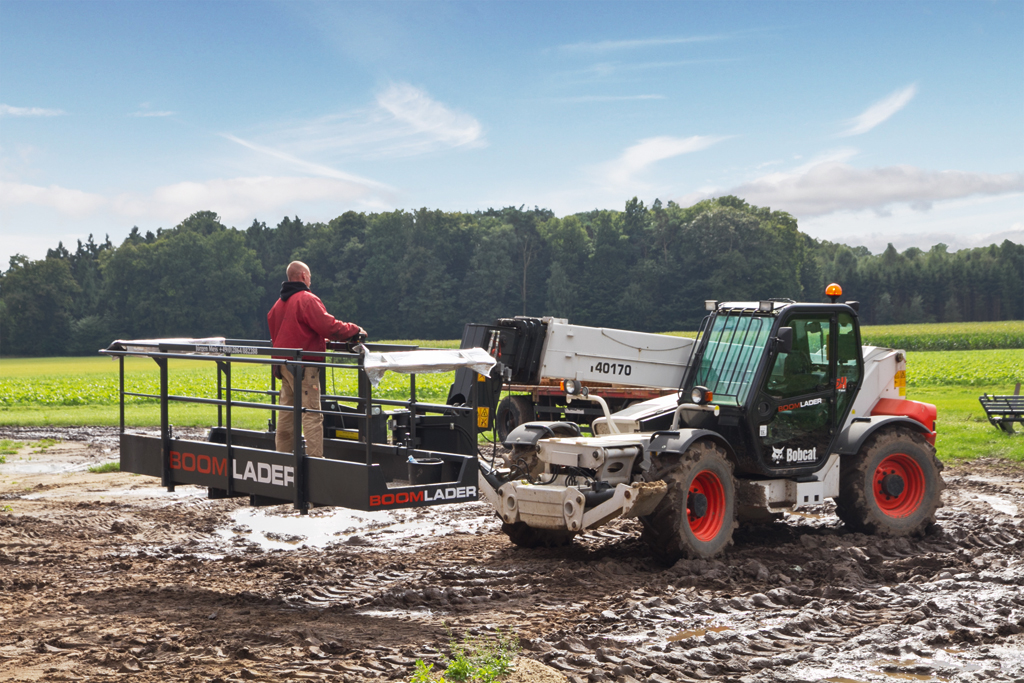 Das neue K+K‐Zugpferd verbindet die Vorteile gleich mehrerer Maschinen in einer. Der Boomlader, dessen Basis der starre Bobcat Teleskoplader T 40170 liefert, ist eine multifunktionale Arbeitsbühne, die bei hochgefahrenem, einteleskopiertem Ausleger vollständig aus dem Arbeitskorb verfahrbar ist ‐ inklusive aller Abstütz‐ und Nivellierungsprozesse. Somit verbindet der BOOMLADER ‐ weltweit einzigartig ‐ die Vorteile einer Boomlifter‐ Arbeitsbühne mit denen eines Teleskopladers. „Gerade bei Arbeiten auf unbefestigtem, unebenem Gelände und der Montage großer Verkleidungsteile ist der Boomlader jetzt schon nicht mehr wegzudenken“, führt Berthold Kuckuck weiter fort.