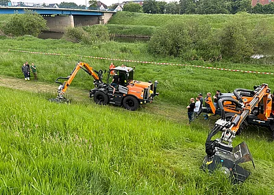 Nach der Umrüstung des Geräteträgers in die mera-Ausstattung können weiche Untergründe an Gewässerrändern und Böschungen ohne erhebliche Schäden am Boden befahren werden, ein großes Plus für alle Flächeneigentümer und Dienstleister. Mit einer großen Bereifung bis 710/50-26.5 wird der Bodendruck gesenkt und eine schonende Gewässerunterhaltung ist möglich.