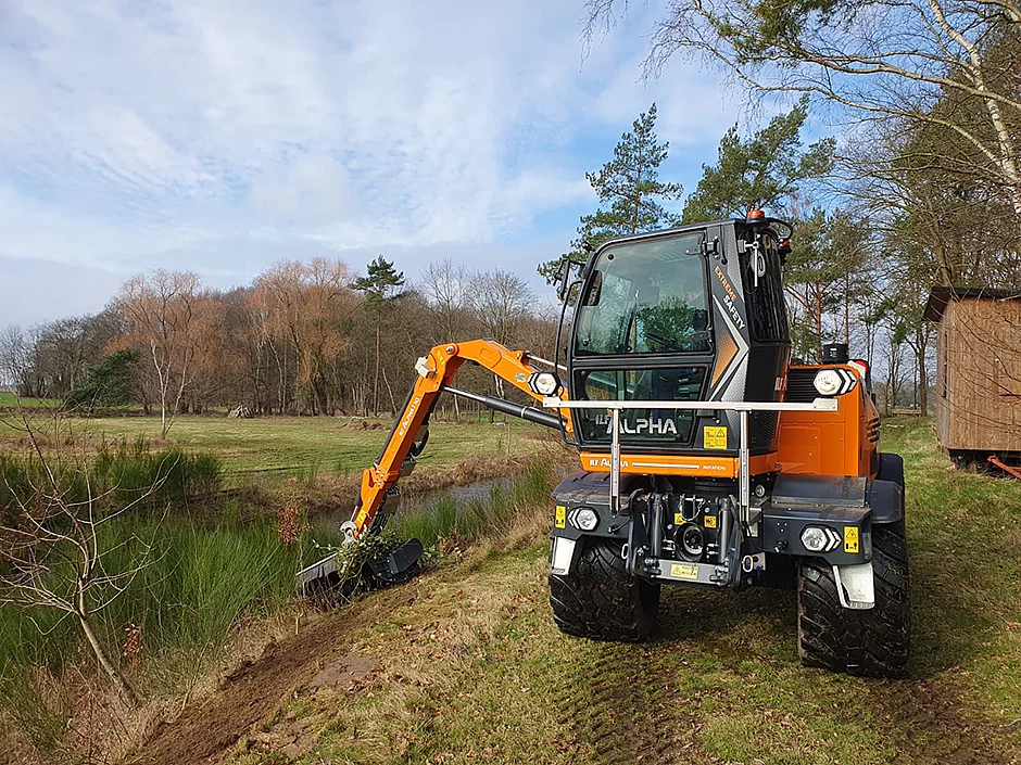 Darüber hinaus wurde eine Lösung für bessere Traktion in unwegsamem Gelände gesucht. Die Lösung für diese Anforderung stellt eine größere Bewegungsfreiheit in der Pendelachse durch eine Achserhöhung um bis zu 150 mm dar. Insgesamt wirkt der Energreen ILF ALPHA nach dem Umbau zwar mächtiger, verhält sich aber sanfter und schonender für den Boden, bietet Sicherheit und erhöhten Arbeitskomfort. Diese Spezifikationen ergänzen die werkseitigen Vorteile der Trägermaschine. Das Gerät bietet eine Drehkabine zur besseren Sicht auf das Arbeitsgerät, bringt eine Auslegerreichweite von bis zu zwölf Metern mit und erzielt eine hohe Standsicherheit bei hoher Reichweite. Eine Hochdruckhydraulik stellt den Antrieb von verschiedenen Anbaugeräten sicher: Grasmulcher und Mähkörbe für die Flur- und Gewässerpflege, Forstmulcher, Astsägen, -scheren und Fällgreifer im Gehölzbereich.