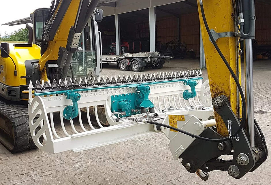 Aufsatzgitter und hydraulische Schwenkfunktionen runden das Portfolio ab. Durch einen erhöhten Drehmoment und das einzigartige Exzenter-Prinzip im Antrieb erzielen die Mähkörbe MKL und MKB hervorragende Leistungen. Mit robustem Getriebeantrieb wird Typ „Schwer“ an Hydraulikbaggern ab zehn Tonnen eingesetzt und erreicht mit kraftvollen Messerbewegungen hohe Schnittleistungen bei bis zu fünf Metern Arbeitsbreite.