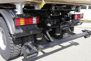 Für den Actros neu ist ein patentiertes Straßenfertigerpaket für den luftgefederten Kipper, das den Luftbälgen und Kunststoffteilen am Heck besonderen Schutz angedeihen lässt. Das Straßenfertigerpaket besteht aus hochgesetzten und mit Schutzgitter sowie Ösen versehenen Rückleuchten, seitlich nach innen versetzten Rückstrahlern sowie gekürzten Kotflügeln mit klappbaren Spritzlappen und einem klappbaren Heckunterfahrschutz. Dieser Heckunterfahrschutz dient - sobald er nach unten geklappt ist - als Anfahrschutz für die Luftbälge. Zugleich kann der Fertiger bündig an die Stange andocken und den Kipper auf diese Weise leicht schieben, auch wenn der Unterfahrschutz seinerseits bündig zu den Reifen sitzt: Spezielle Rollen an beiden Enden der Stange stellen einen reibungsarmen Kontakt zwischen dem Unterfahrschutz und den Reifen sicher.