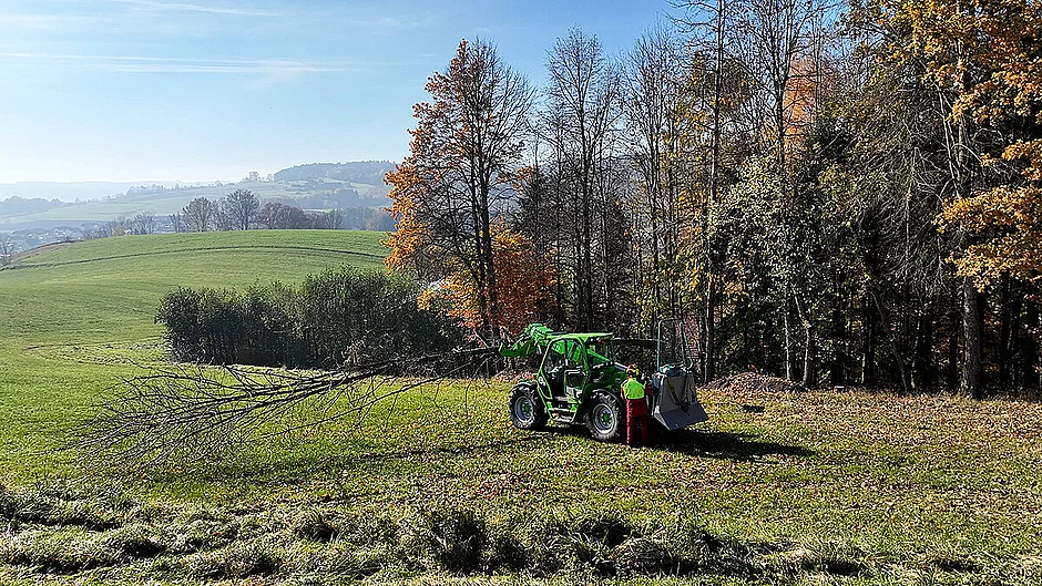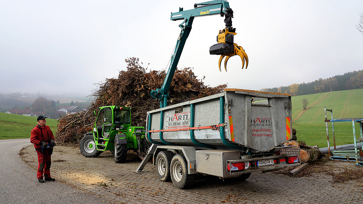Bei Hartl kommt der Multifarmer auf rund 250 Betriebsstunden pro Jahr. Im ursprünglichen Lieferumfang waren Lastgabeln, eine Schaufel sowie ein Lasthaken enthalten. Hartl nutzt den Teleskop-Traktor in erster Linie für die eigene Hofstelle – mit ihm produziert er Hackschnitzel oder ordnet das Holzlager. Dabei hält der Classic 2 den Hof instand und räumt Laub weg, er zieht den Rückewagen oder fährt den Kipper – um Sand oder Kies zu holen – und außerdem transportiert er Hackschnitzel oder Fräsgut.