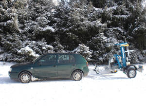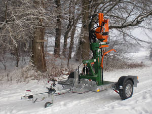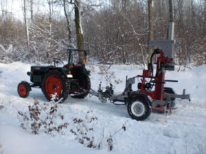 Weiter können Sie z. B. einen Holzspalter mit 800- 900 KG und schwerer mit dem PKW, wie auch mit einem kleinen Traktor, transportieren und betreiben. Durch den Einsatz einer Gelenkwelle durch seitliches Versetzen des Traktors können Sie Ihr Gerät antreiben, wenn Sie mit der Gelenkwelle den Turm seitlich umgehen.