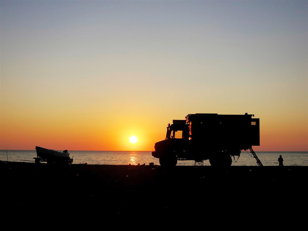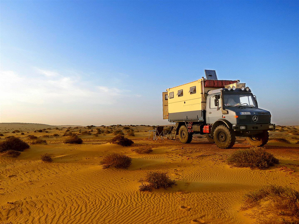 Nach unvergesslichen Wochen in Persien konnten Jennifer und Peter Glas ihren vierrädrigen Reisegefährten im Oman endlich auf Herz und Nieren prüfen: auch hier erwies sich keine Düne zu steil, keine Wüste zu weit und kein Strand als unerreichbar. Und auch die wüstenerprobten Omaner freuten sich über den Unimog – einige steckengebliebene SUVs zog der Unimog sogar aus dem Sand.