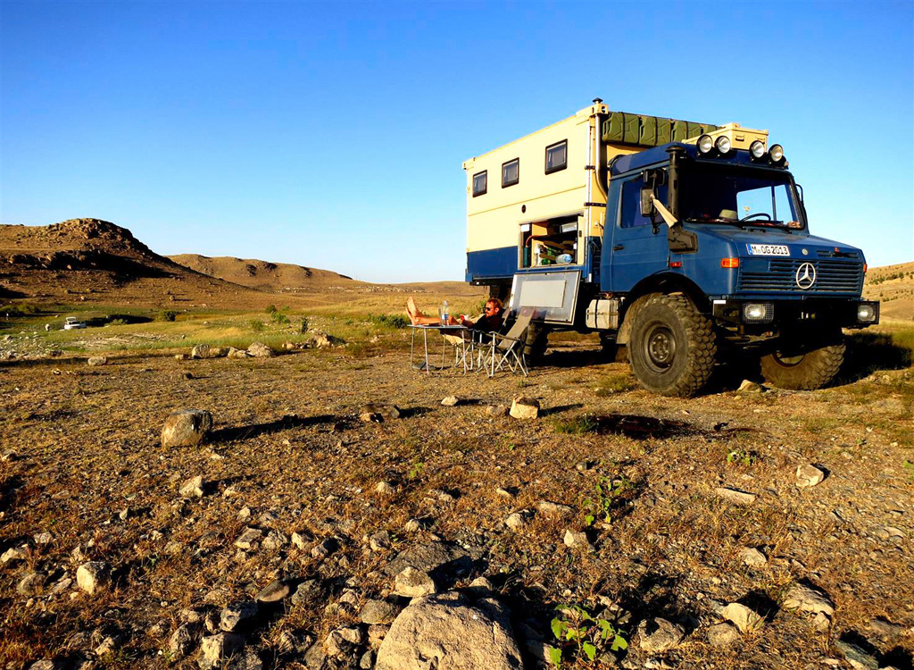 Die große Reise begann im April 2013 und führte durch Südosteuropa in das oft unwegsame anatolische Hochland: Kein Weg war zu steinig, kein Fluss zu tief und kein Pfad zu steil. Nach dieser ersten kleineren Prüfung in der Türkei ging es in den Iran. Die Sanddünen in der Dasht-e-Kavier Wüste waren schon eine etwas größere Herausforderung. Doch viel beeindruckender als die Leichtigkeit, mit der der 435er durch Sand und Gestein glitt, waren die leuchtenden Augen der Iraner, wenn sie den fremden Unimog sahen. Die Situationen, in denen sich Mercedes-Benz-Fans neugierig unter das Fahrzeug legten oder im Motorraum umsahen, waren unzählig.