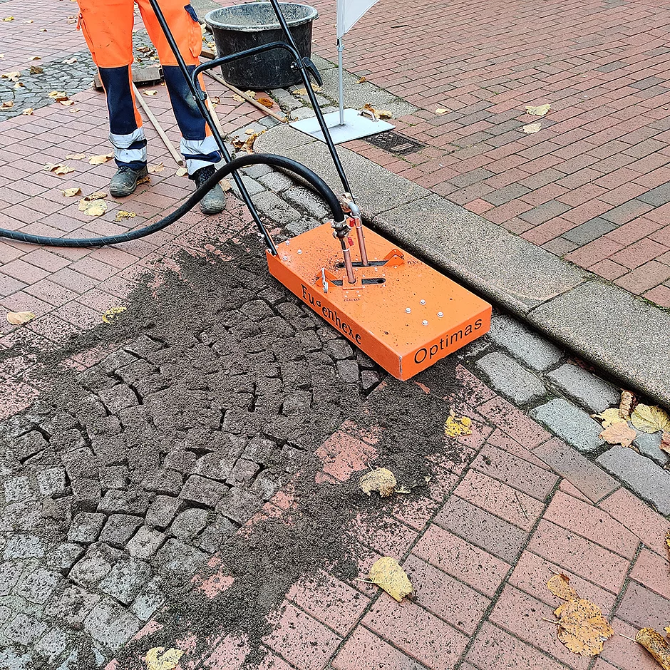 „Vor diesem Hintergrund ist es notwendig, Aufgaben schnell und wirtschaftlich zu lösen. Deshalb haben wir vor zwei Jahren die Optimas Fugenhexe angeschafft. Mittlerweile konnten wir die Erfahrungen machen, dass das eine hervorragende Investition war“, sagt der Zuständige für den Einkauf des Bauhofes Norbert Bornemann. Wie in vielen Städten und Gemeinden wurde auch in Haltern am See in den achtziger Jahren in der Innenstadt eine Fußgängerzone mit Natursteinpflaster und Granitbänderung verlegt. Im Laufe der Jahrzehnte hat sich die ursprüngliche Fugenverfüllung zerlegt oder ist verkrautet. Stück für Stück müssen nun hier, wie bei vielen anderen Wegen auch, die Fugen gereinigt werden, um dann mit einem haltbaren Kunststoff-Material verfüllt zu werden. „Die Fugenhexe hat bisher schon exzellente Dienste geleistet. Nicht nur, weil sie die Fugen sauber reinigt, sondern auch, weil wir keine aufwendigen Maßnahmen zum Schutz von Gebäuden oder Fahrzeugen gegen herumfliegende Steine oder Material ergreifen müssen“, sagt Bornemann.
