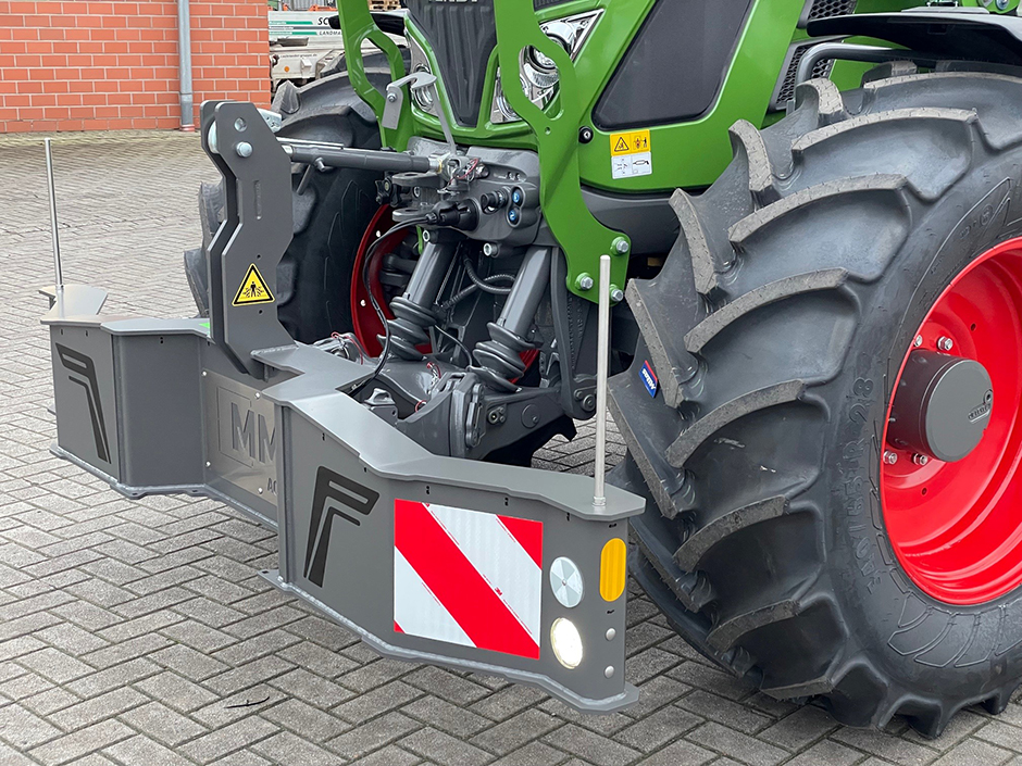 Außerdem ist der MMS-SafetyBumper mit einer Kat.2-Aufnahme in drei unterschiedlichen Breiten erhältlich, 2.400, 2.600 und 2.800 mm. Neben den Standardfarben AGCO grau, JD grün und schwarz matt können alle weiteren RAL-Töne für die farbliche Gestaltung gewählt werden. Das individuelle Edelstahl-Emblem bietet ein laserbares Logo.