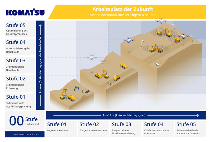 Gegenwärtig gibt es keinen existierenden Weg, wie der autonome Betrieb von Baumaschinen in der Bauindustrie verwirklicht werden kann. Jedoch glaubt man bei Komatsu, dass es nicht ausreichen wird, nur autonome Maschinen zu bauen. Einen Gesamtüberblick zu haben, nicht nur visuell, sondern auch in Form von Daten, ist essentiell, um Sicherheit, Effizienz und große Implementierung auf die Baustelle der Zukunft zu bringen. Im vergangenen Jahrzehnt hat das Autonome Transportsystem von Komatsu (AHS) im Tagebau-Einsatz für den Transport von über zwei Milliarden Tonnen Material gesorgt. Das ist eine Leistung, die die Praktikabilität autonomer Systeme beweist. Mit den Erfahrungen und Erkenntnissen, die Komatsu bei der Entwicklung dieser Systeme gewonnen hat – im Übrigen sechs Jahre vor der kommerziellen Verfügbarkeit von GPS – will sich Komatsu nun auf die nächste große Neuerung bei autonomen Operationen konzentrieren.