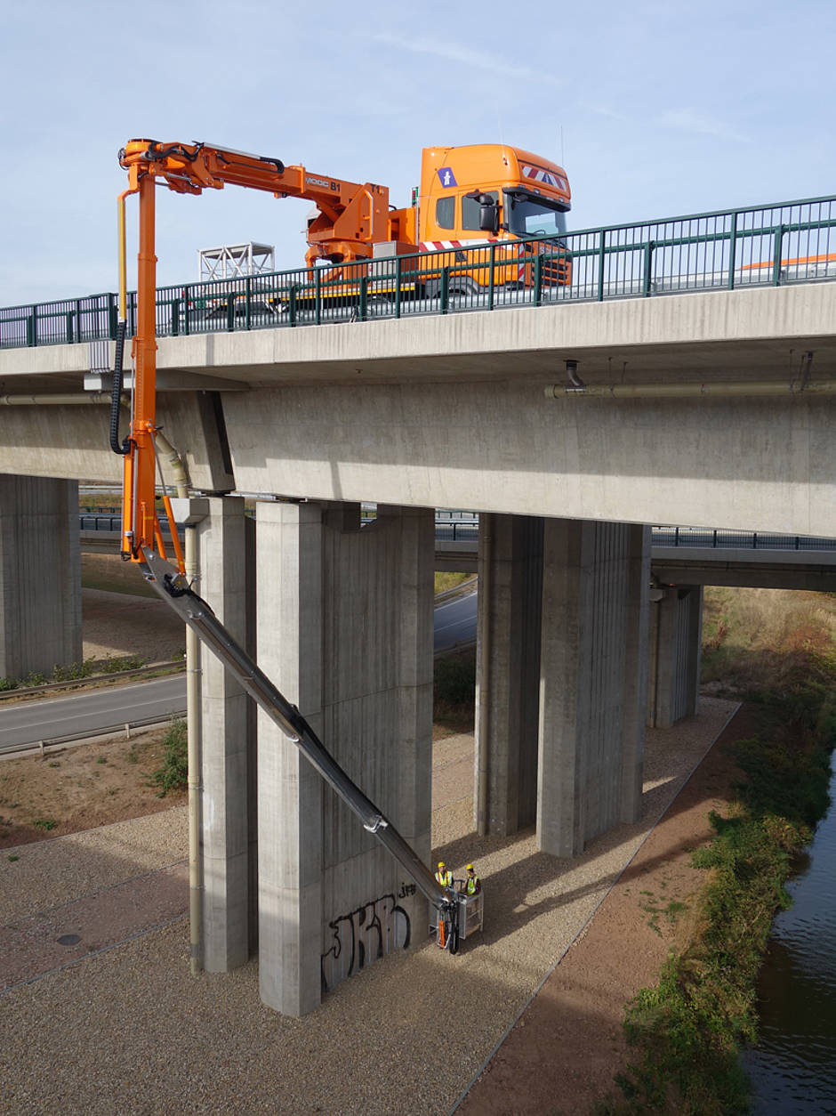 Das Top-Model MBL 1750 ist ein Arbeitsbühnen-Aufbau auf einem Scania R410 8x4 Trägerfahrzeug mit einem Gesamtgewicht von 32 Tonnen. Die Spezialarbeitsbühne erlaubt es Fachkräften, Inspektionen und Messungen an der Brückenunterseite von der Straße aus durchzuführen. Wichtiger als die Arbeitshöhe von 23 m, ist hier der Unterflur Arbeitsbereich von 20 m und eine max. seitliche Reichweite von 17,50 m. Die Korblast beträgt 280 kg.