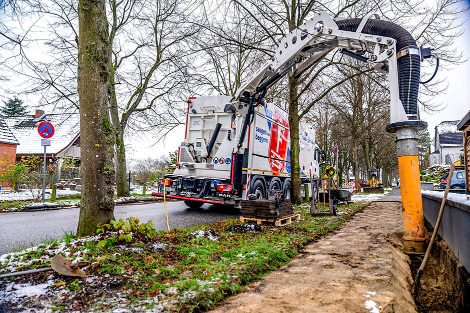 Eigentlich ist das primäre Einsatzgebiet des Dino12, der 2021 von Flenker Bau angeschafft wurde, nicht der Hoch-, sondern der Tiefbau, insbesondere für Arbeiten in der Nähe von Infrastrukturleitungen. „Glasfaserleitungen, Wasser- und Stromkabel – die liegen leider nicht immer dort, wo die Pläne sie verorten“, konstatiert Anders-Küßner, „da reißt ein Baggerlöffel schon mal etwas weg und hinterlässt kostenintensive und den Zeitplan verzögernde Schäden.“ Mit dem Dino12 braucht er jetzt nur noch einen Facharbeiter, der per Fernsteuerung den Saugschlauch führt und das Material zwischen den Leitungen schonend und sicher heraussaugt.
