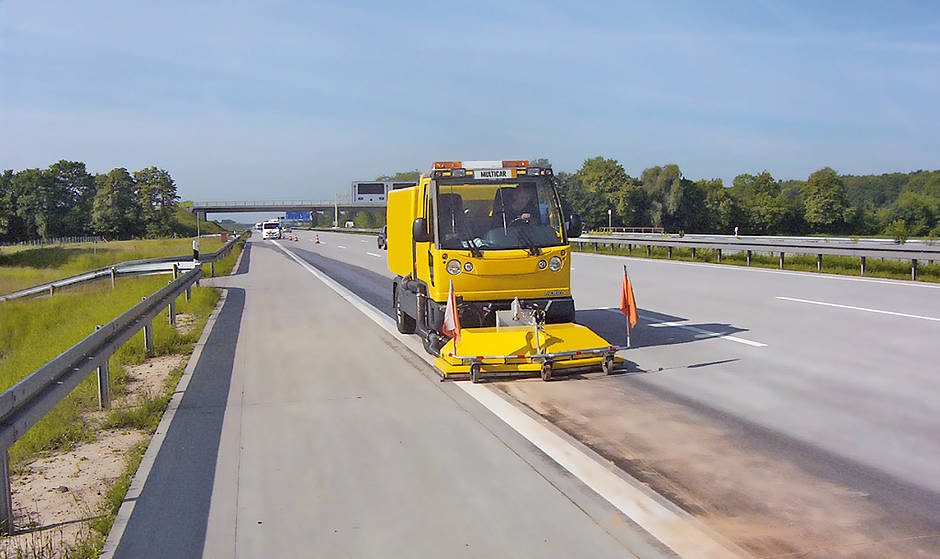 Das Absaugen und Reinigen erfolgt im geschlossenen System. Dank einer Arbeitsbreite bis 1700 mm und einem 1100 Liter fassenden Frischwassertank lassen sich auch größere Verkehrsflächen schnell, porentief, umweltschonend und schadstofffrei reinigen. Auf der Fahrbahn bleiben keinerlei ölhaltigen Rückstände zurück, die später wieder aufgeschwemmt werden könnten. So wird die Griffigkeit nachweislich auch dann wiederhergestellt, wenn es anschließend regnen sollte.