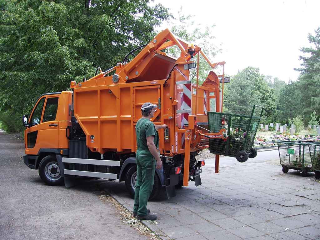 Der Müllpressaufbau mit seiner hydraulischen Hubkippvorrichtung wird an die Einkreishydraulik des Geräteträgers angeschlossen und von diesem mit einer Leistung von 45 l/min bei 200 bar Betriebsdruck versorgt. Er eignet sich zur Aufnahme von verschiedensten Sammelgefäßen, vom Drahtgitterkorb auf dem Friedhof, bis zu Müllgroßbehältern mit 80 bis 770 Liter Fassungsvermögen. Durch Beschickungstüren an beiden Seiten des Containers lassen sich auch Papierkörbe bequem entleeren. Ist der Container voll, lässt er sich einfach über die integrierte hydraulische Kippvorrichtung nach hinten auskippen.