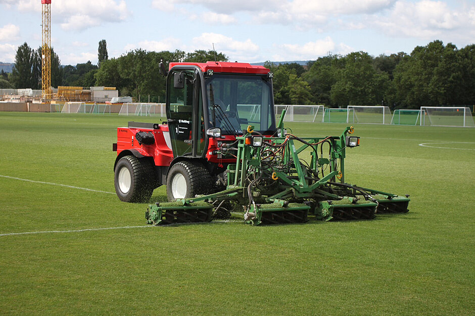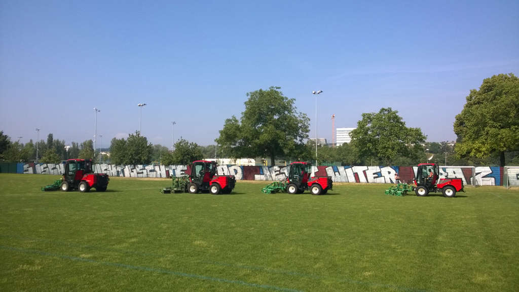 Der Hauptkostenfaktor für die Instandhaltung von Naturrasenfußballfeldern ist das Mähen, und dank der optimalen hydraulischen Kraftübertragung auf das Mähwerk erhöht sich die Mähgeschwindigkeit um 30%, für erhebliche Ersparnisse in der Vegetationszeit. Für den ersten Schnitt im Frühling wird einen Sichelmäher benutzt, dann bekommen die Multihogs ihre Sommerausrüstung: vier 5facher Spindelmäher für den Einsatz auf mittleren Sportanlagen, und ein Multihog wird mit einem 7fachen Spindelmäher augestattet für die 20 Fussballfelder, wo eine sehr feine und besonders hohe Schnittqualität verlangt wird.