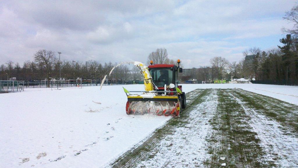 Die Schneeräumung auf den Natur-, und Kunstrasenflachen, den Hockeyfeldern, den Betriebswegen und den Wegen um und in den Sportanlagen konnte dank der auf drei der Multihogs angebrachten Schneefräsen messbar verbessert werden. Mit diesen sehr kraftvollen Anbaugeräten kann der Schnee erstmalig von der Mitte eines Fußballfeldes in die gewünschte Richtung außerhalb des Feldes weggeblasen werden. Die Zeit-, Geräte-, Personal- und folglich Geldersparnisse sind beeindrückend.