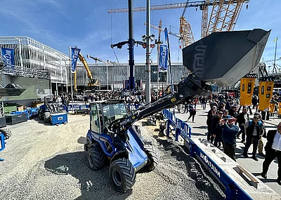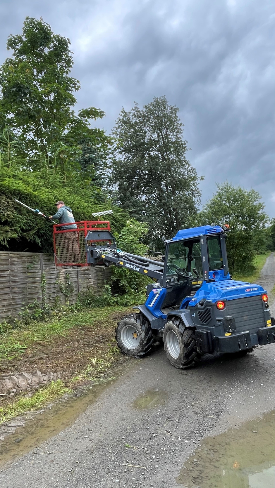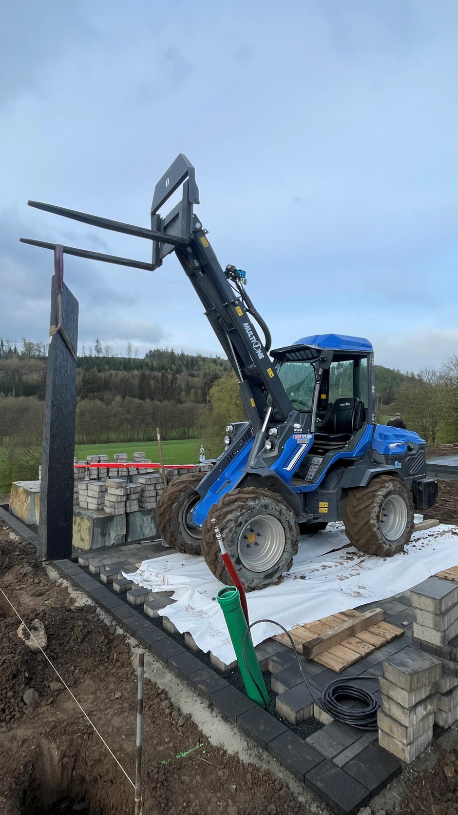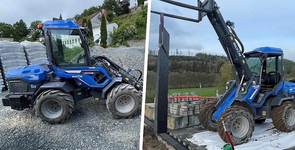 Henze war wichtig, einen kompakten, wendigen Knicklader zu beschaffen, der erstens mit dem Pkw auf einem Anhänger transportiert werden kann. Und zweitens eine Palette mit Pflastersteinen von 1,8 Tonnen in die Höhe hievt. Unter solchen Voraussetzungen geht derzeit nichts am Flaggschiff von MultiOne – dem 11.9 – vorbei. „Mein Mitarbeiter und ich waren auf der Messe auf dem Kindel die ersten auf dem Platz. Wir fanden den Blauen super, und die Maschinendemo hat uns echt überzeugt“, schildert er. Noch am selben Abend flattert Thomas Sterkel, CEO der MultiOne Deutschland GmbH, die ausführliche Angebotsanfrage Henzes ins Haus – respektive ins Messe-Hotel. Schließlich sprechen die Leistungsdaten des Kompaktladers für sich: 75 PS starker Stage-V-Dieselmotor von Kohler, hydrostatisches One-Drive-System mit 35 km/h Top-Speed und Allrad, satte 3,70 Meter Hubhöhe, bis zu 2.620 kg maximale Hubkraft, je nach Kontergewicht sowie ab lediglich 2,3 Tonnen Eigengewicht.